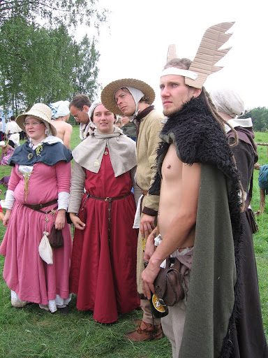 Kengät eivät näy, mutta muuten Grunwald-look oli aika vaaleanpunainen. Etualalla patsastelevan Ninon erikoinen asustus johtuu taistelun kenraaliharjoitusten jumalteemasta. (Kuva: K. Valanne 2012)
